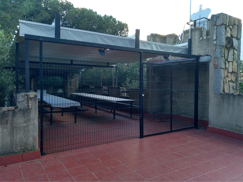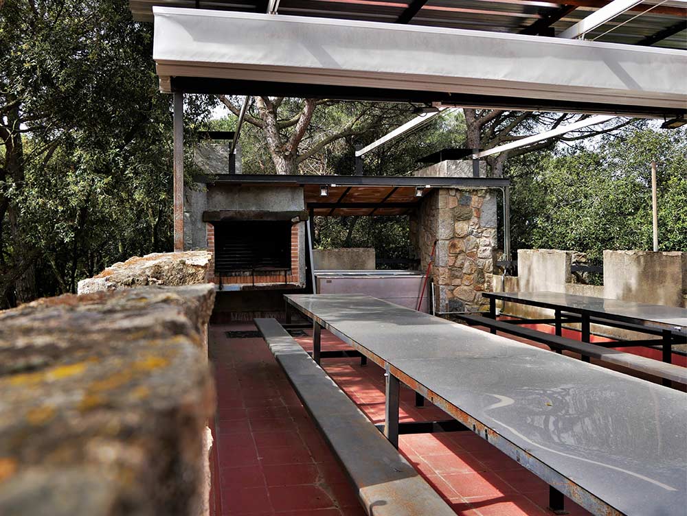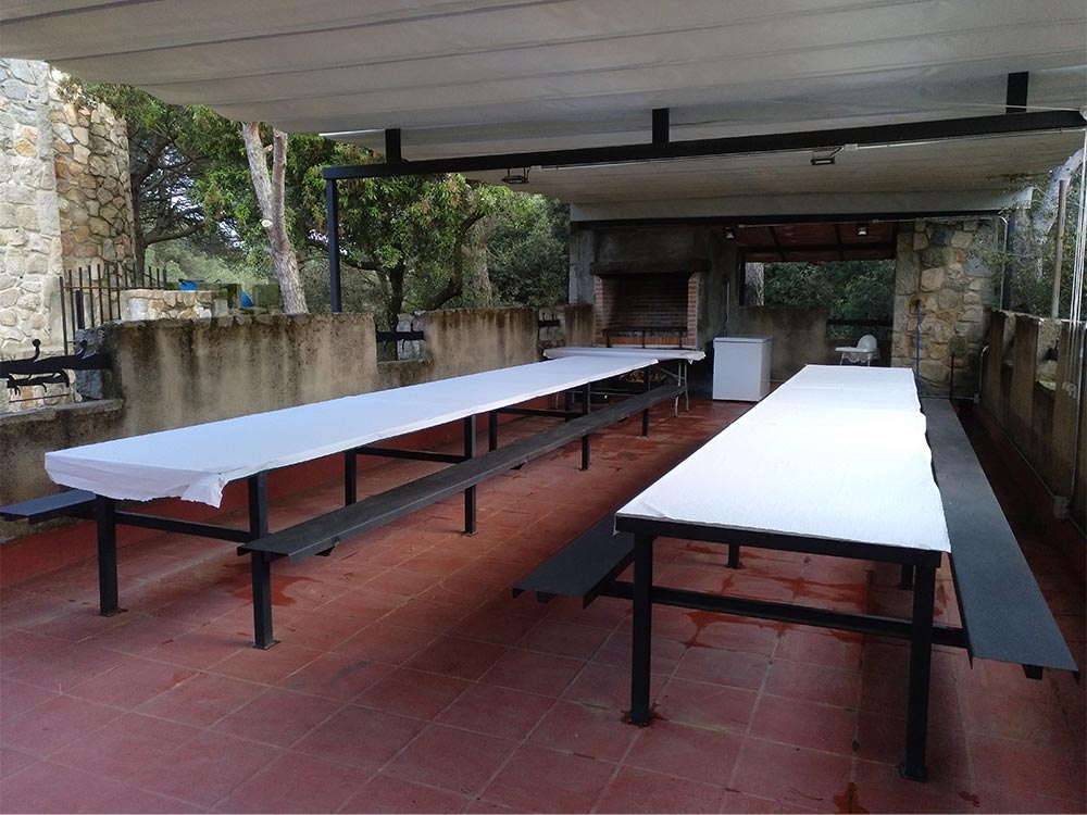 > Consta de 2 taules de ferro de mida 6 m x 1 m i 1 taula d’exterior de mida 180 cm x 70 cm), bancs de ferro, congelador (tipus arcon), barbacoa exterior amb dues graelles de 87 cm x 58 cm, llenya, estovalles de paper blanc, vaixella completa (got, plat, forquilla, ganivet, tovalló de paper blanc), trona per a nens, paperera per a escombraries amb bossa inclosa.