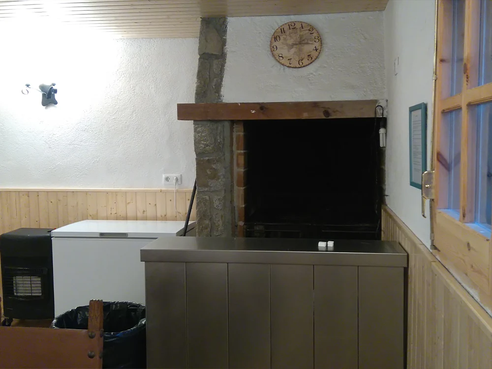 > Consta de 5 taules de fusta (4 d’elles de mida 205 cm x 69 cm i 1 d’elles de mida 120 cm x 70 cm), 30 cadires de fusta, congelador (tipus arcon), estufa de butà, barbacoa interior amb una graella de 72 cm x 59 cm, llenya, estovalles de paper blanc, vaixella completa (got, plat, forquilla, ganivet, tovalló de paper blanc), trona per a nens.